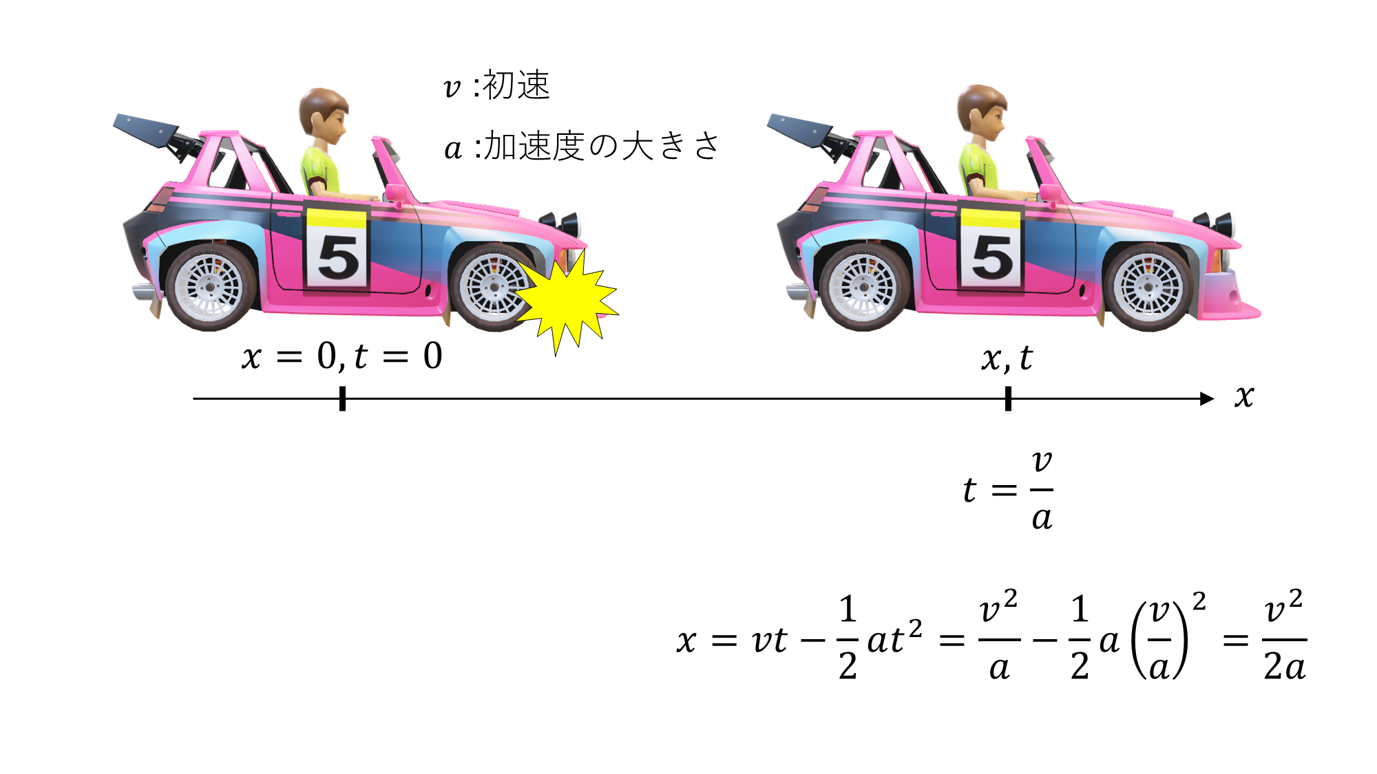 つまり、停止するまでの「時間」は「速さ」に比例し、停止するまでの「距離」は「速さの2乗」に比例するのです。
