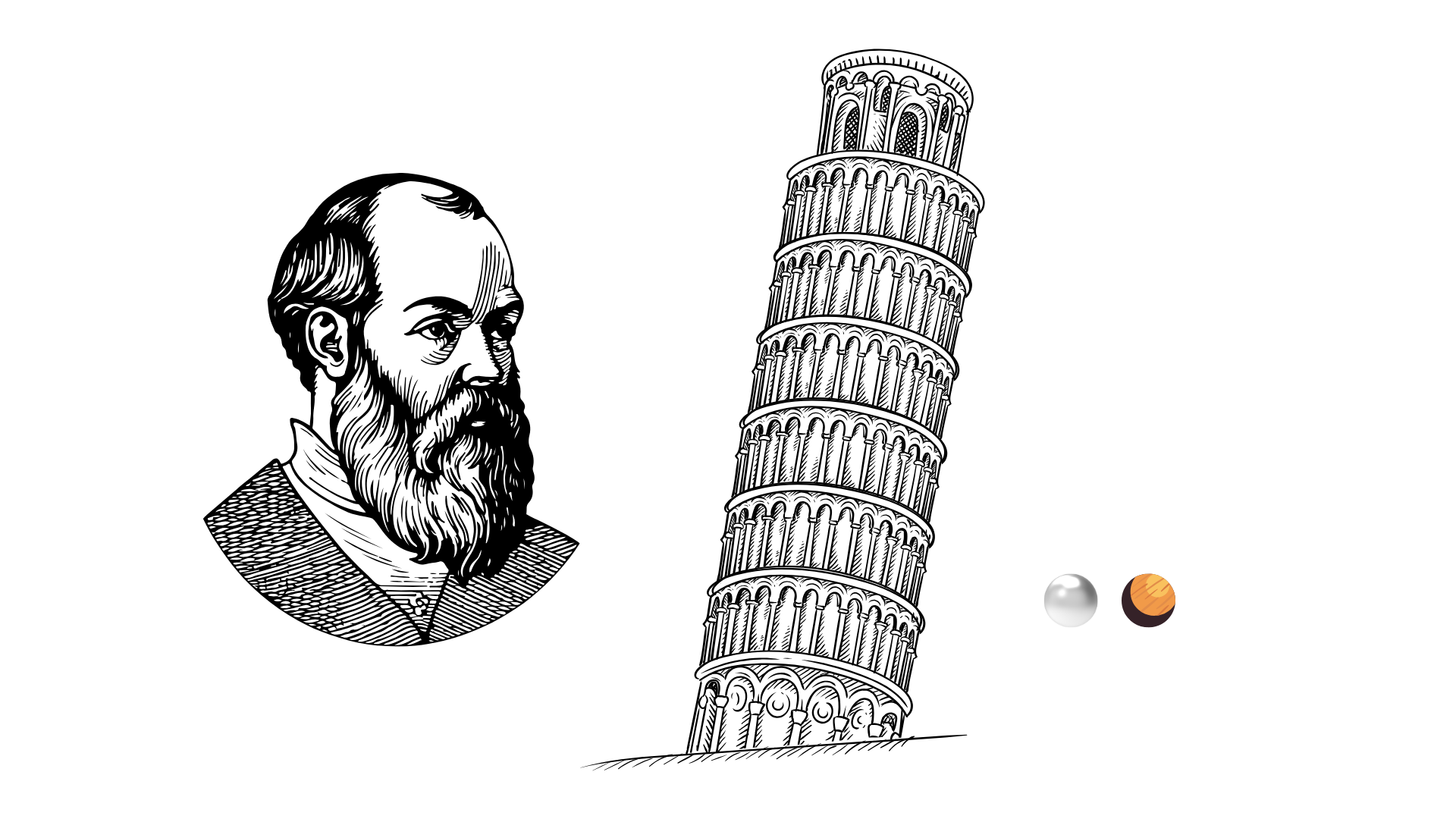 重い物体と軽い物体を同じ高さから落下させるとき、空気抵抗の影響がなければ地面に同時に到達することを見いだしたのはガリレオでした。