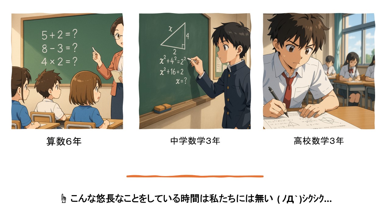 だったら、まず中学校ぐらいの数学からやり直してみるか…と思うかもしれませんが、さすがに小学校の算数からやり直そうと思う人は少ないでしょう。