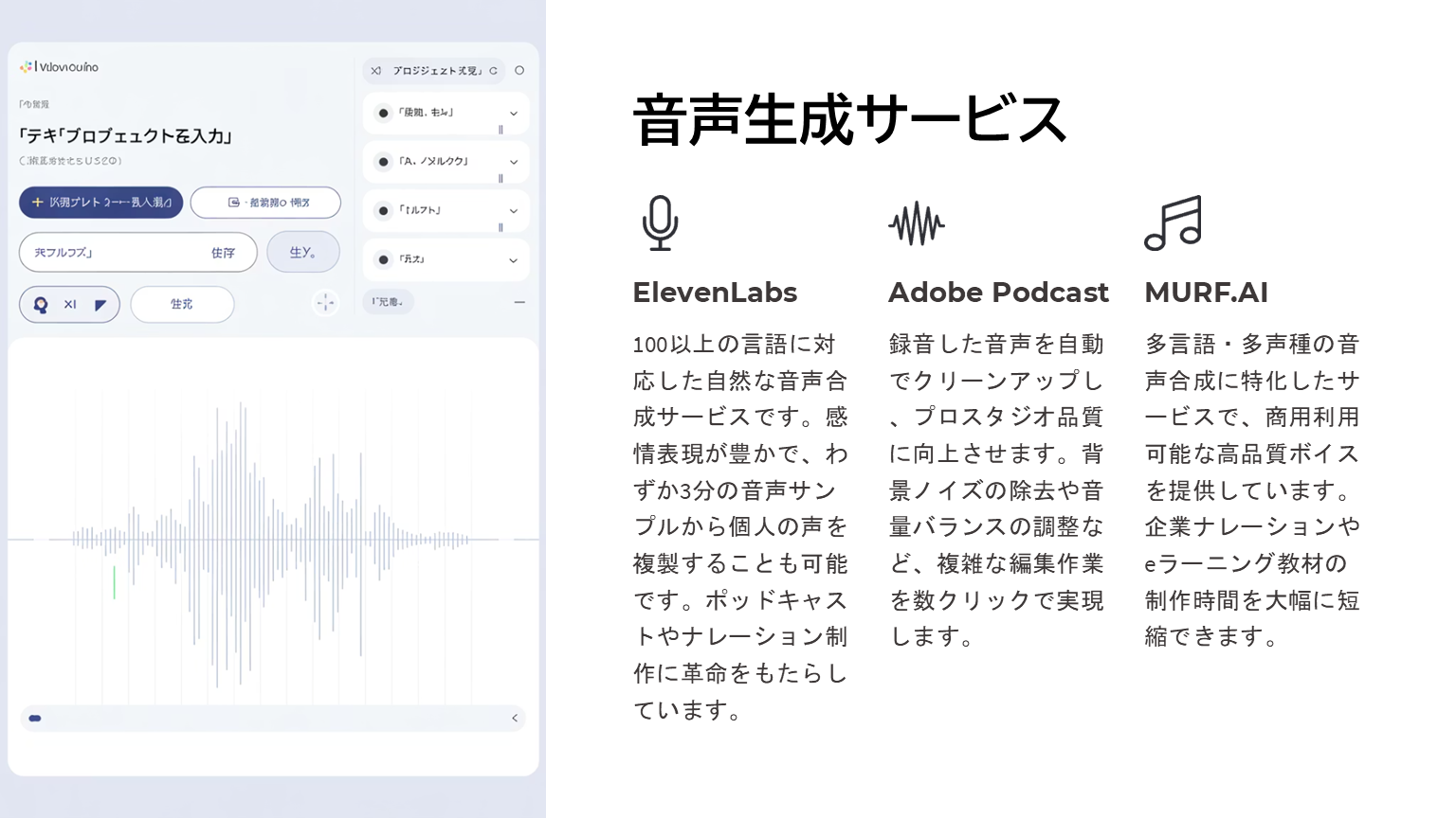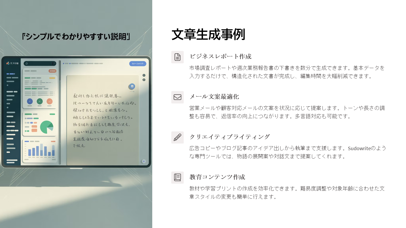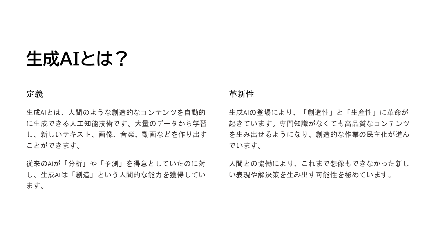 生成AIの活用事例や、どんなサービスが存在するかなど、詳細に伝わるプレゼンテーションになっていますね。